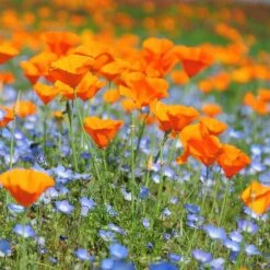 This famous flower, the state flower of California, (a very similar sub-species is called Mexican Gold Poppy) carpets whole coastal hillsides up and down the Pacific coast, creating one of the most famous natural wildflower displays in the world, usually in April. Viewing this spectacle from their ships, Spanish explorers thought the “golden display” meant that there was in fact, gold to be found in the flowery hills. California poppy performs well almost everywhere with its dusty dark green ferny foliage and brilliant golden orange cup shaped flowers. A blooming plant is somewhat frost-resistant, and often reblooms nicely in fall meadows. Flowers close in cloudy weather. The name “Eschscholzia” is after the Russian botanist, J. F. Eschscholtz, who visited the California coast in the early 1800’s. AL TEST