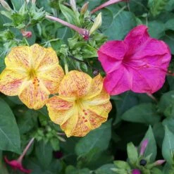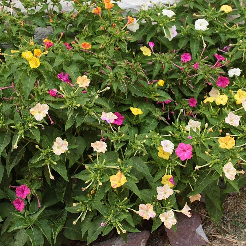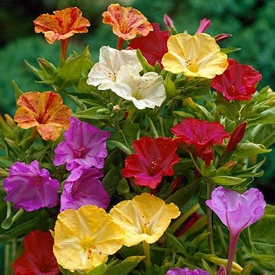 (24-36″ tall) Here’s a favorite from your grandmother’s garden. Four O’Clocks are world famous, and sometimes called the ‘Marvel of Peru’. They are native in Peru, and the ‘Marvel’ part is because these short, bushy plants open lovely tubular flowers in several colors–the same plant may have two or three colors in bloom at any given time. These fascinating flowers can be grown from seed, but with our bulbs (which form in time when you plant the seed), they grow much more quickly, giving you months more of the flowers. Simply lift the bulbs in fall like dahlias, and replant for more flowers the next spring.