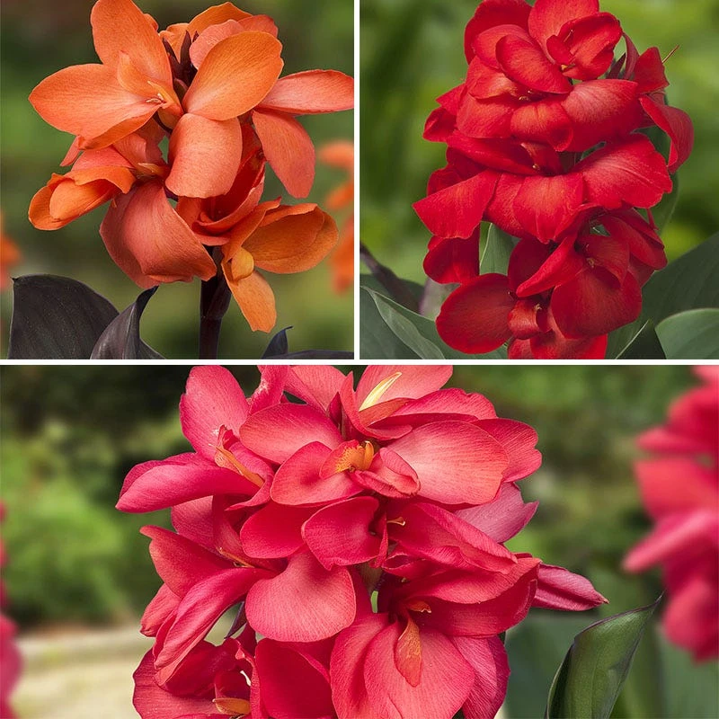 The Happy Hummingbird Canna Collection thrives in the heat and humidity of summer, bringing bold, lasting color to sunny beds and borders. Bright blooms attract hummingbirds, while the clean foliage keeps gardeners happy. All varieties included are from the Cannasol™ line and certified virus free.  CannaSol™ Happy Carmen pairs vivid red flowers with deep green foliage, while CannaSol™ Happy Isabel adds a softer touch of pink blooms and blue-green foliage. For a rich contrast in the garden and patio pots, CannaSol™ Happy Wilma sets velvety coral pink blooms against deep plum-colored foliage. Deadhead spent blooms to keep plants blooming all summer long. Cannas are easy to grow in full sun and rich, moist soils that are well-drained. Grow as a perennial in warmer regions (Zones 7-10) and dig for winter storage or brink indoors in cooler regions.