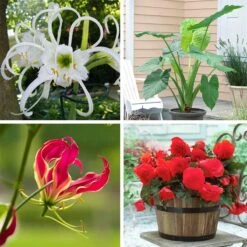Our Rainforest Retreat Bulb Collection is the perfect way to bring a taste of the tropics to your home. Our bulb collections will easily give you beautiful, harmonious results in garden beds and floral arrangements. We plan, you plant: each collection is curated by our gardening experts, featuring flower groupings with complementary colors, heights, and bloom times. Peruvian Daffodils are hardy in zones 7-10, and Gloriosa Daisies, Upright Elephant Ears, and Tuberous Begonias are hardy in zones 8-10. In cooler zones, these bulbs and tubers can be dug after frost comes, stored over winter, then re-planted the following spring; if planted in containers, they can be overwintered indoors.
