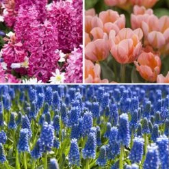 The Rhapsody Bulb Collection opens with a bang in mid-spring with color that lasts and lasts. The bulbs in this collection create a lovely layered effect in the garden. Hot Pink spikes of ‘Jan Bos’ Hyacinth stand over a carpet of Grape Hyacinth. ‘Pretty Princess’ Single Early Tulip brings movement to the planting, with dazzling pink and yellow blooms, swaying atop long stems. Rose and yellow accents on the petals of ‘Pretty Princess’ echo the richly colored blooms of its companions. This generous collection of ninety-tow bulbs is perfect for massing in sunny beds and borders or along walkways. Keep a few bulbs aside to tuck into containers near the doorway where you can enjoy the wonderful perfume! Hardy in zones 3 through 8, provide a well-drained soil and plenty of spring sunshine.Â
