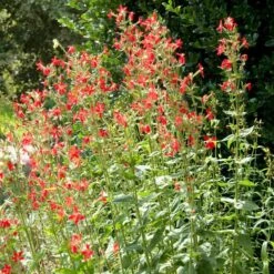 Royal Catchfly (Silene regia) is a rarely seen native prairie perennial. Bright red flowers are borne in clusters in summer near the tips of long stems, each one advertising a long, tubular calyx. Unfortunately for small gnats and flies, the tubular, sticky calyxes are known to trap small flies – its common name, Catchfly, is derived from this unusual adaptation. Royal Catchfly is native to the Midwest and Southeast United States, found naturally in dry, rocky soils in open woods, woodland edges, and prairies. Plant Royal Catchfly in a full sun to part shade location sheltered from strong winds. It pairs well with other prairie and meadow natives such as Coneflowers, Iron Weed, and Black-Eyed Susan. Royal Catchfly is fairly deer resistant.Â